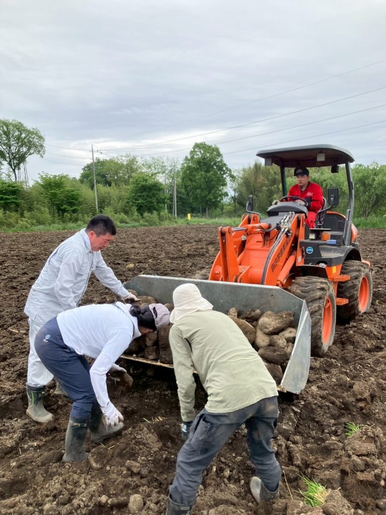 今回の活動では、車や人の通る道を中心に刈払機での草刈りや、畑に点在する大きな石を拾い集めて重機に積み込む作業など、体力の要る作業も多数。
