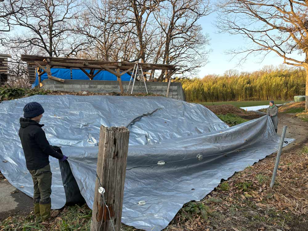今回は堆肥置場に雨が吹き込まないよう屋根を直し、外れたビニールシートを付け直しました。