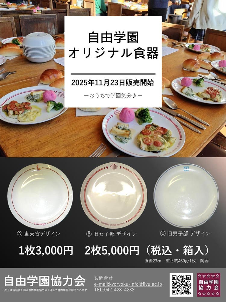 自由学園協力会では、11月23日のJIYU1123のマーケットにて協力会新作のオリジナルグッズと、学園食器を販売いたします。