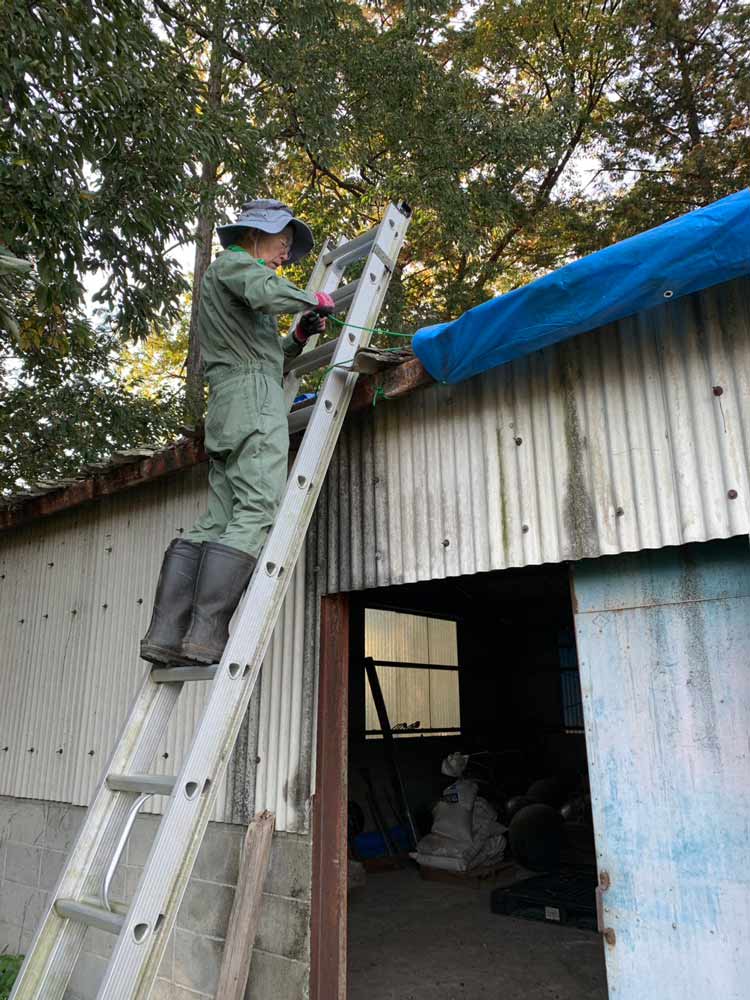農場では、旧農機小屋の雨漏り対策として板を張り替え、ブルーシートを設置。